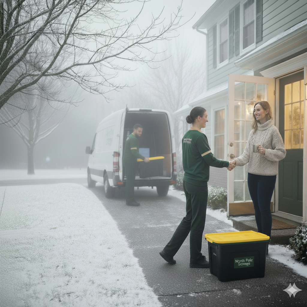 The Pickup (January): When the festivities end, you pack your items into our premium, secure bins. In the second week of January, our team arrives to whisk them away.